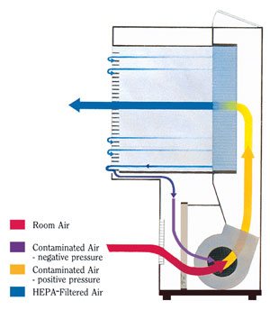在一個水平層流潔凈工作臺,室內空氣通過送風機/電動機吸入到機罩的基礎上,通過一可清洗,可重復使用的預過濾器。引擎蓋通過HEPA過濾器的空氣推高后全會。過濾的空氣在100 FPM朝向用戶的等速橫過工作表面水平地定向。